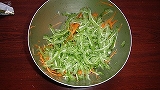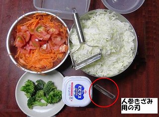 | これらをきざむと、このようになる。 人参だけは使う刃が違う ブロッコリはきざまないで、ゆるめにチンする。。 |