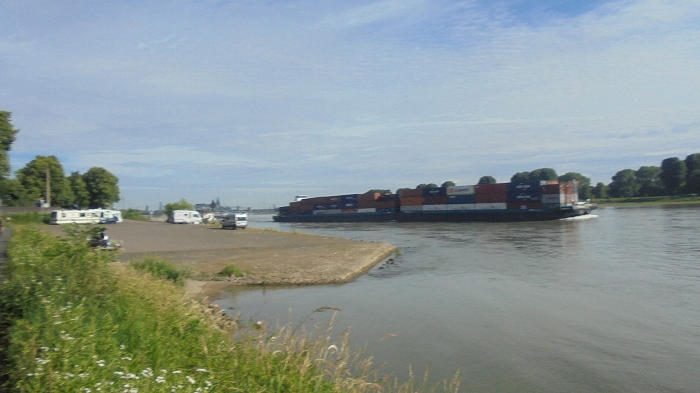 コンテナ満載して川を上っていく船。