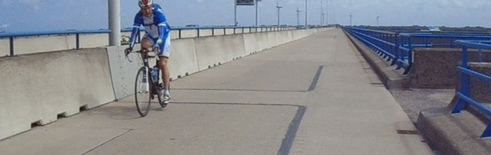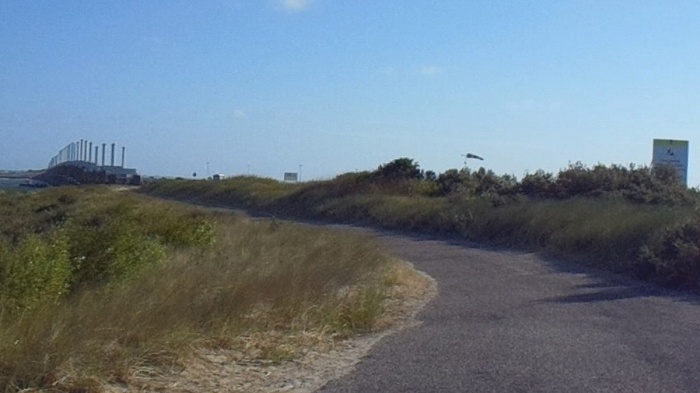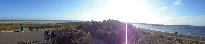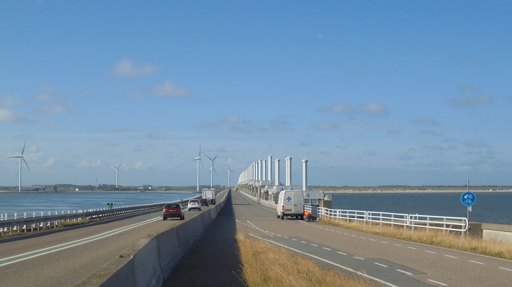 東スヘルデ防潮水門、振り返る。いったいぜんたい、どこを走っていいものかさっぱり分からない。地図と衛星写真と、走ってくる自転車と、色々なことを考えあわせて推測しながら走っています。