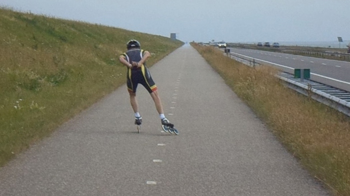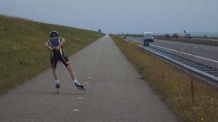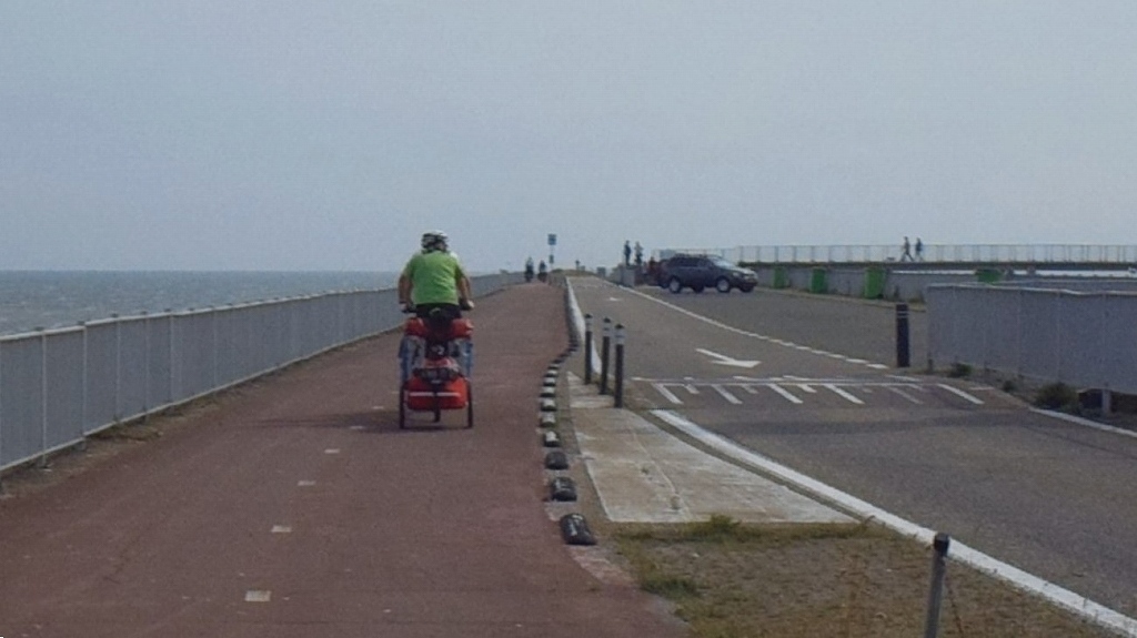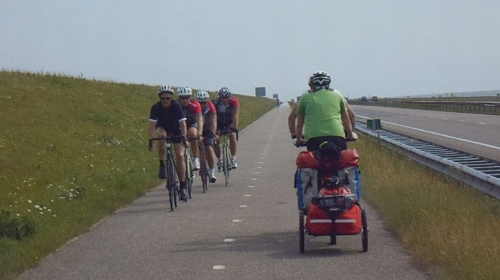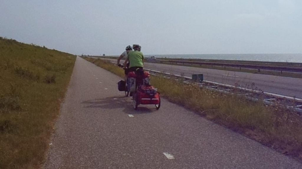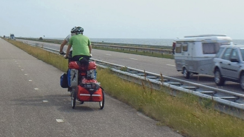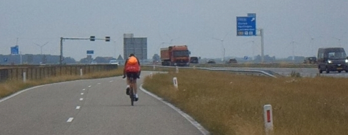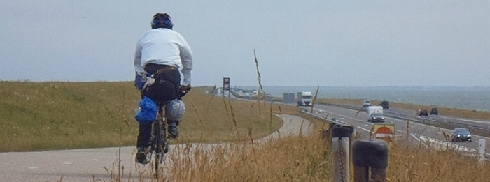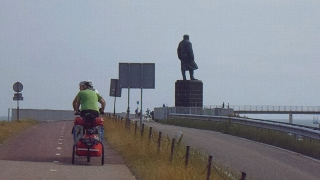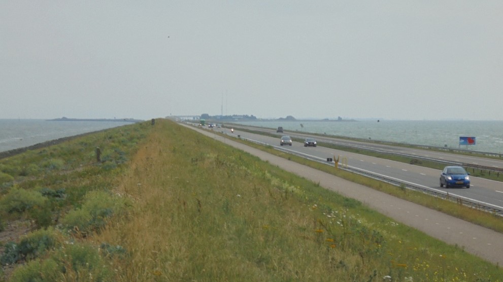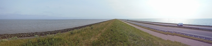 いま、ここにいます。アプスライトダイクという締切堤防。全長32km普通のスピードで渡るだけでも2時間かかります。アイセル湖と北海を分ける堤防です。