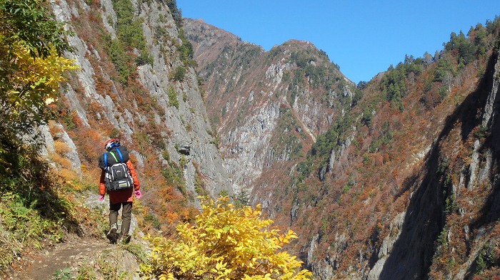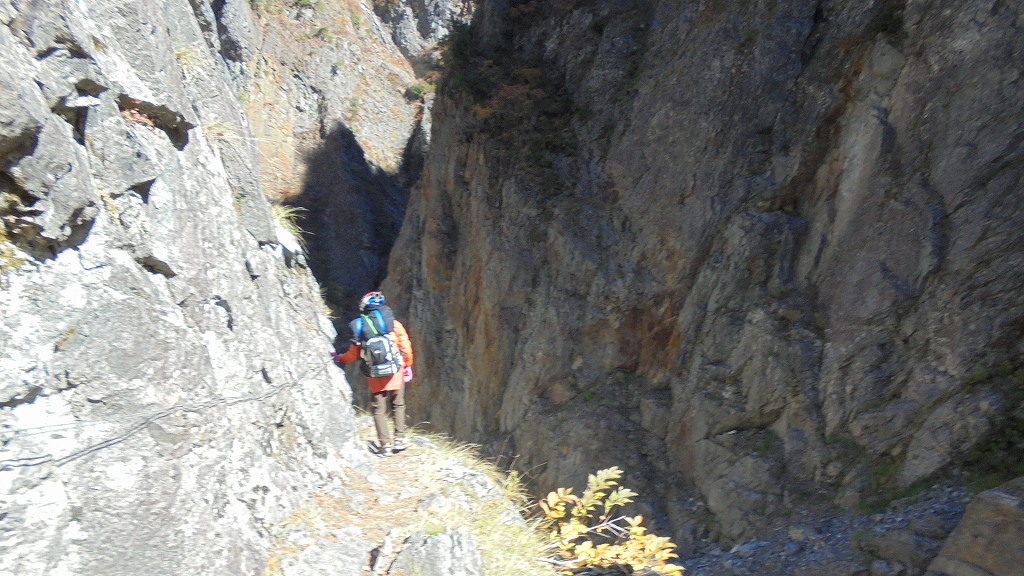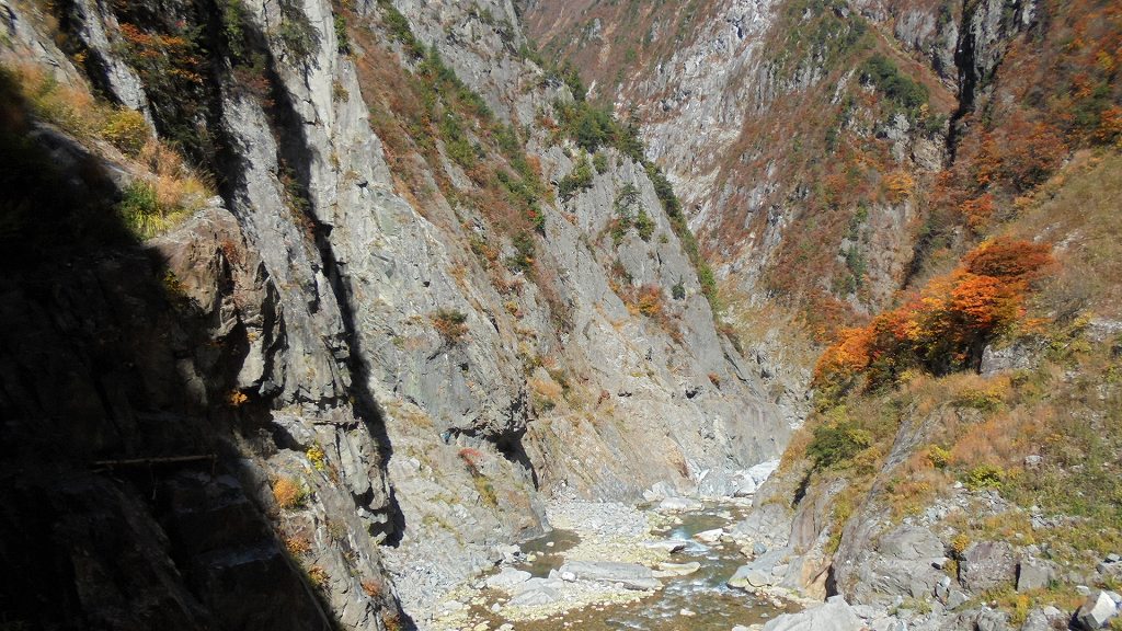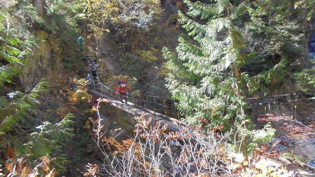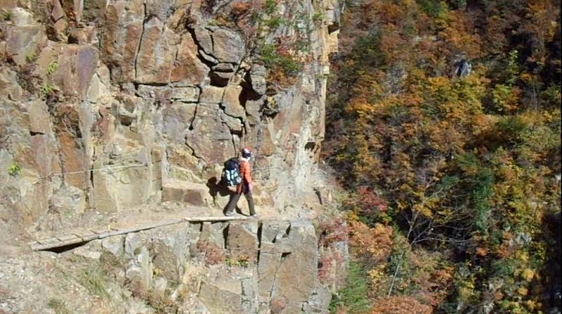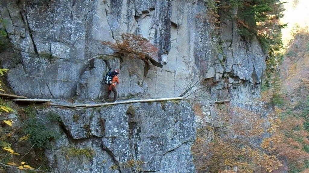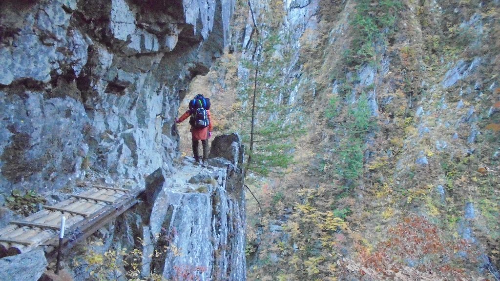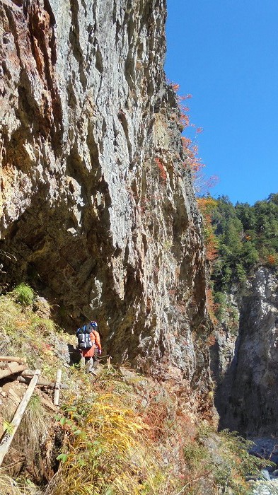 ここは切り立った渓谷沿いを歩く上級者向きの登山ルートです。危険個所が連続するうえに、開通期間も、雪のない一年のうちほんの1か月前後しかなく、なかなか行けないところです。