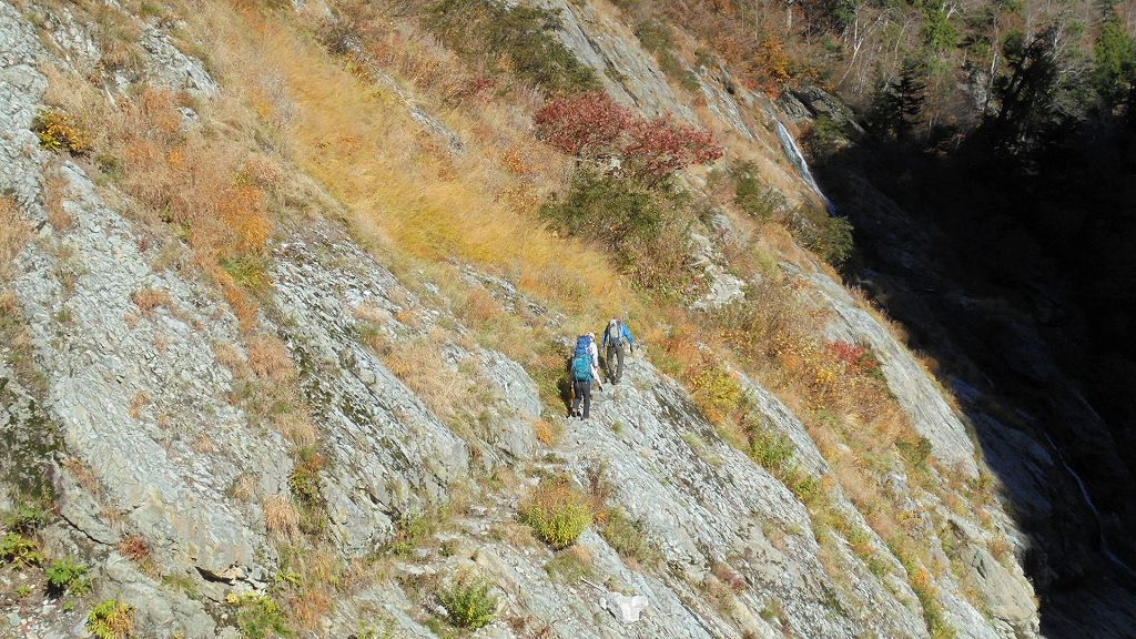 沢登りや沢沿いの道で、難しい滝や岩場などを避けて迂回して悪場の先に出ることを「高巻き」と言いますが、まさに、ここがそうです。