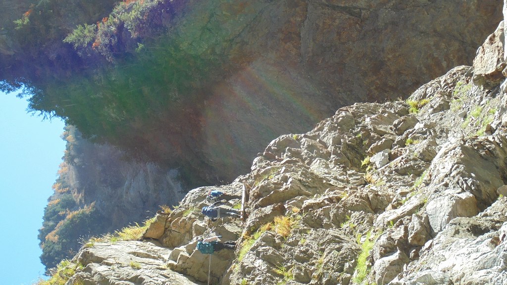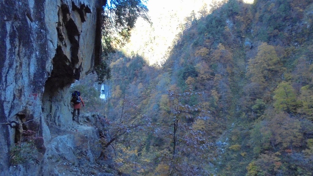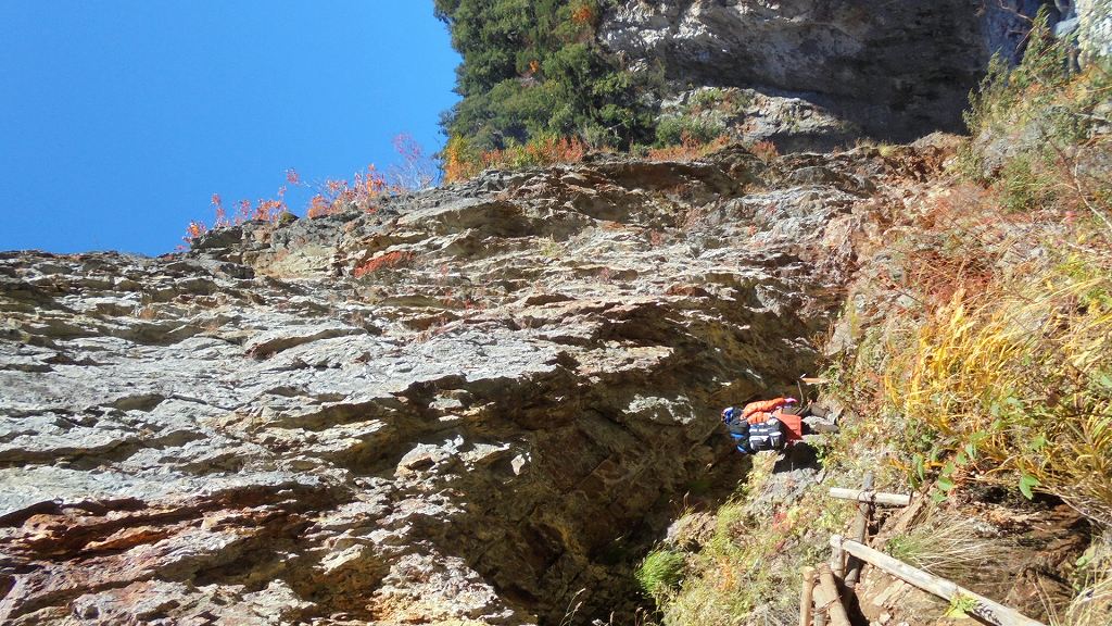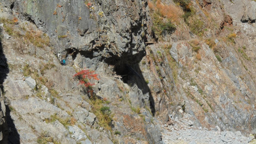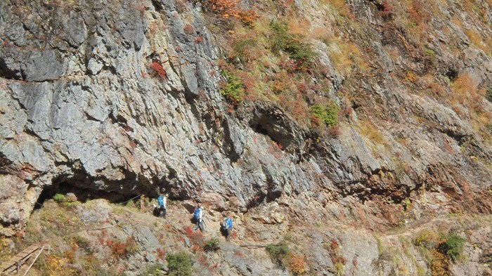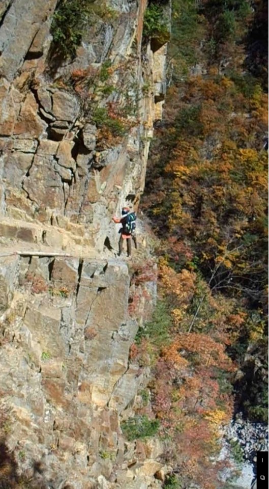 高度感のある非常に狭いルートが続く。岩盤をくりぬいてたコの字の中、屋根の下を歩くような道が続く。柵はなく山側に一本通してるワイヤーを手すりの代わりにして歩く。ワイヤーを掴むのに気持ちが集中していて、対向する人とすれ違う時以外は高さに怯える暇はない。