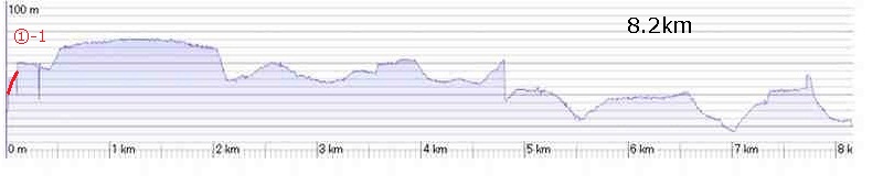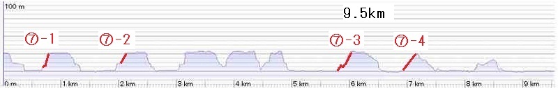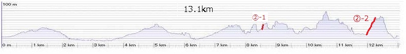 いちばん坂の多いコースです。(3)-1はかなり急です。クロスバイクでは、ぎりぎり上れるかというところです。(3)-2は、トレーニングの方々がよく利用している坂です。