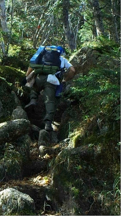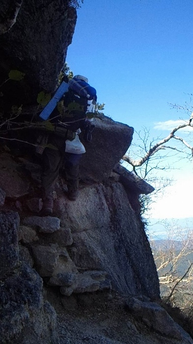 こんなところを登っていきます。ルート開拓にあたって、たぶん、ここしか上るところはなかったのでしょう。足が短いうえに股がひらかない。なかなか上りにくいです。