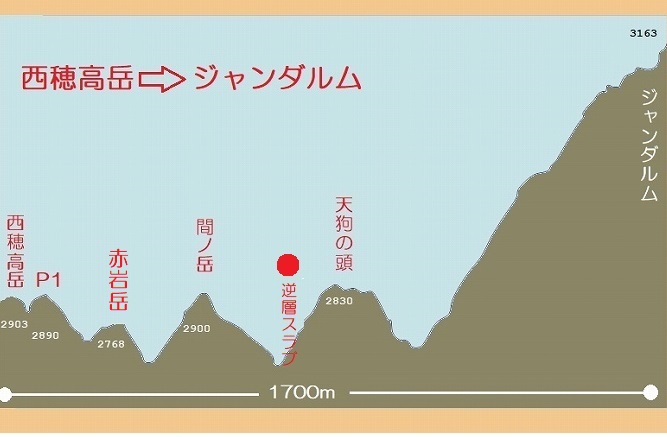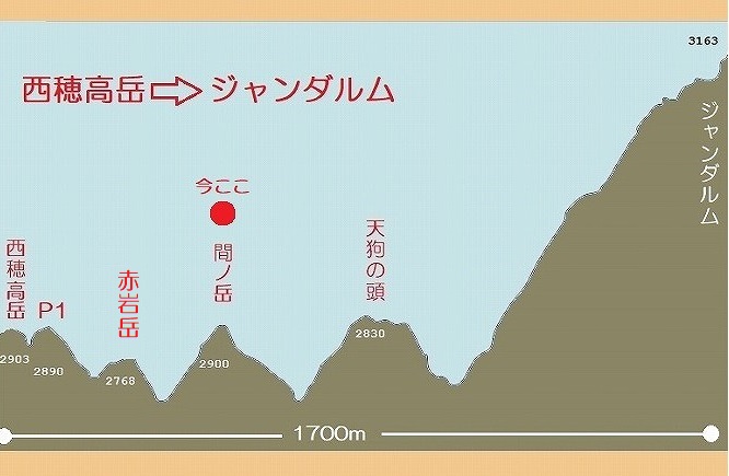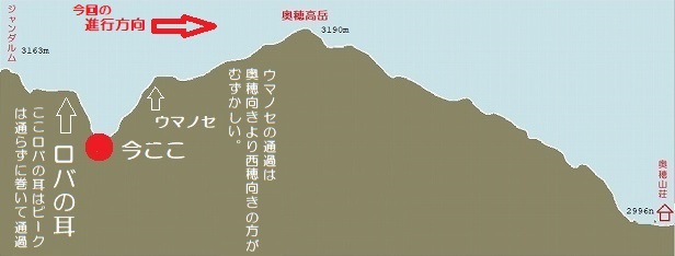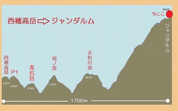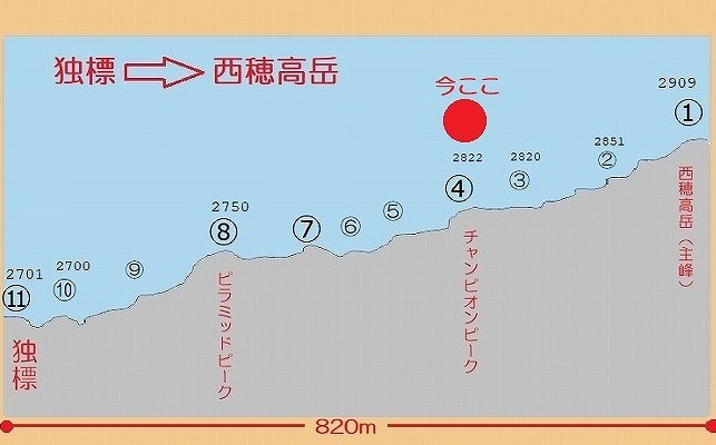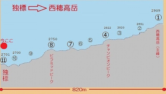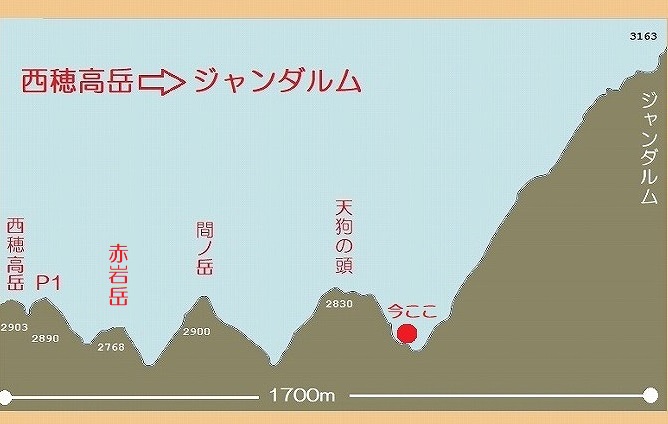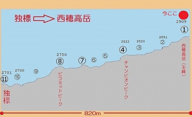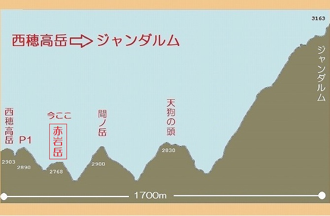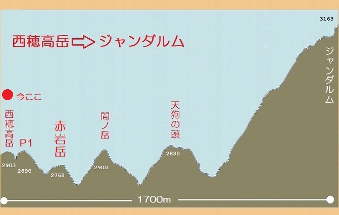 ここから西穂高岳まで800mくらい。上の図の標高は資料によってばらつきがあるので正確ではない。