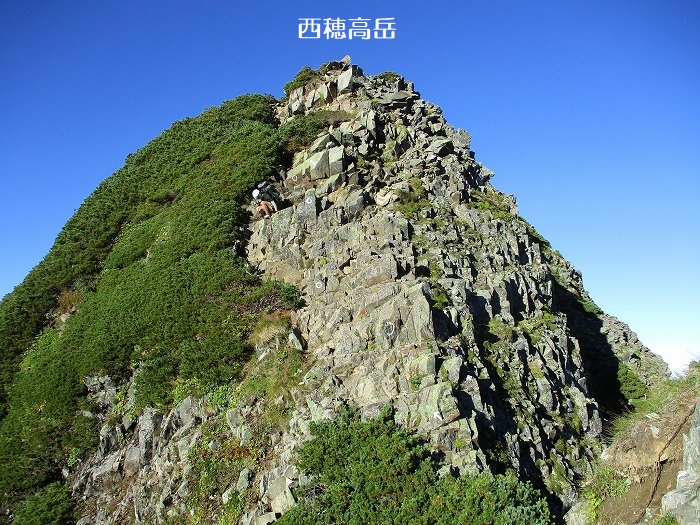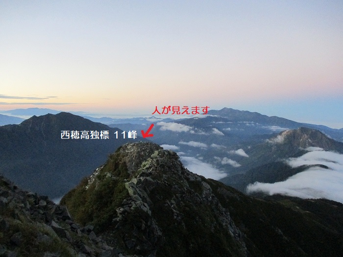 振り返って西穂高独標。西穂高独標は11峰になる。頂上に人がいる。