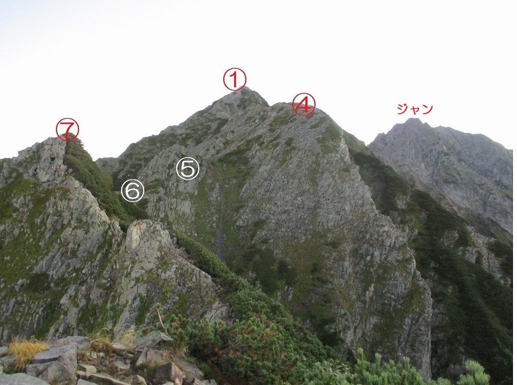 ここを、ぶら下がるようにして下りてきた。ぶら下がったら足が着かなかった。横にある飛び出た石に掴まれば下りれそうだったが、その岩がぐらつきそうだったので、10キロほどのリュックを背負っての懸垂、これはきつかった。そのようにして登り返して、もう一度、下の足場を確認して、横にずれたところの岩にぶら下がってやっと下りてきた。今回の縦走ではここがいちばんヤバイと思った。