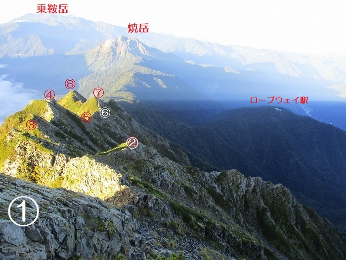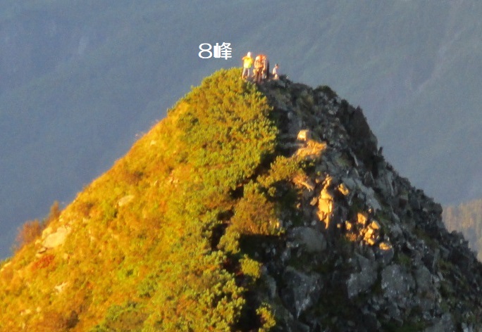 左から8峰、7峰。後ろの方に焼岳。8峰の上に人がいる。