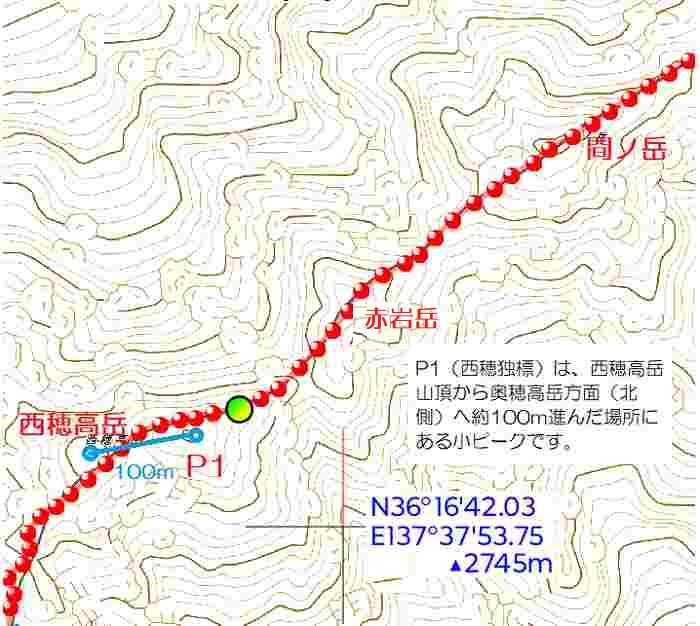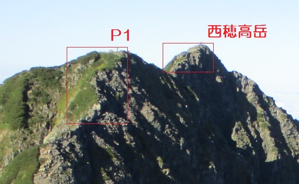 1峰は西穂高岳の山頂をさす。そして間ノ岳のほうへ少し進んだところ(水平距離100m)にある小ピークがP1。