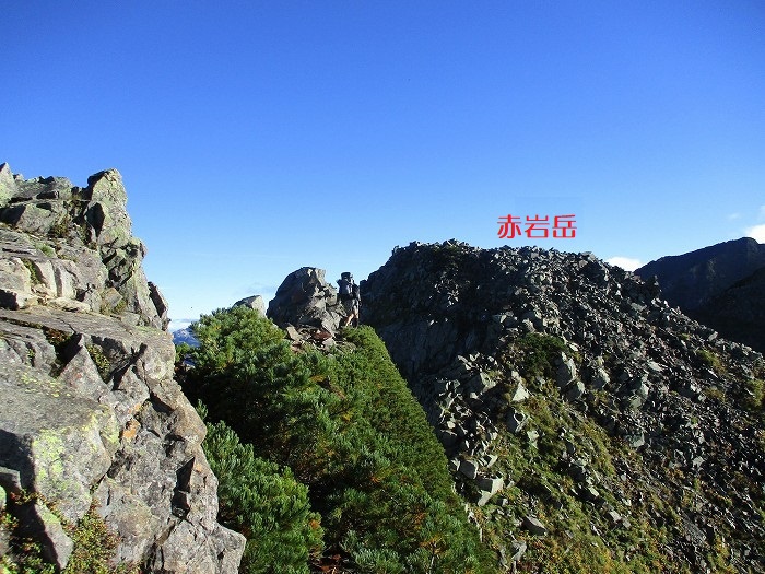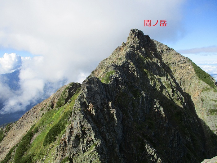 振り返って間ノ岳。ここの下りはきつかった。とにかく鉄棒懸垂の練習はしておいたので、なんとか切り抜けた。