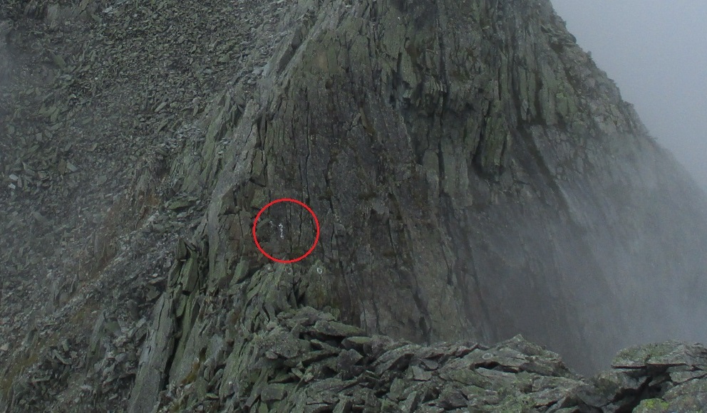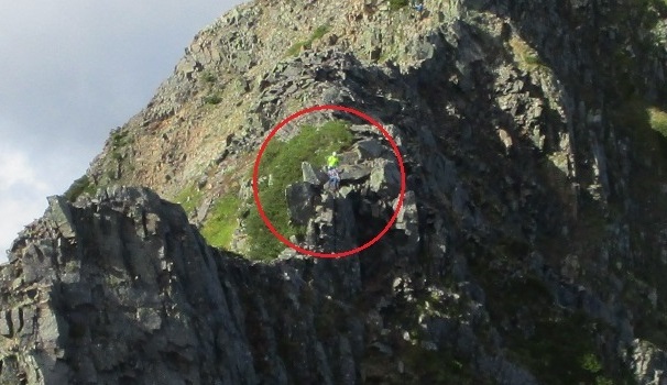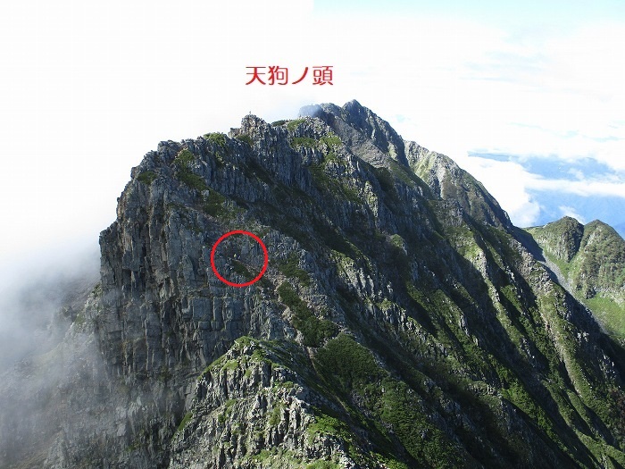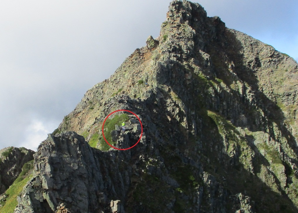 どうにか下りてきて間天のコル。そして逆層スラブです。ここは写真で見るより傾斜はなだらかで左手の方に鎖がついている。矢印のところに人か写っています。この大きさです。