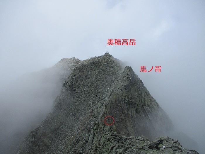 奥穂が見えてきました。手前に馬ノ背、それを登って下って、そして登って奥穂です。奥穂の頂上に人がいます。