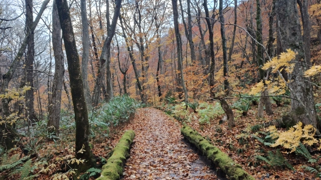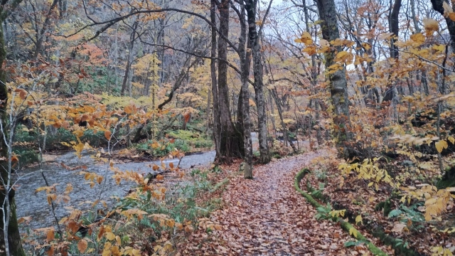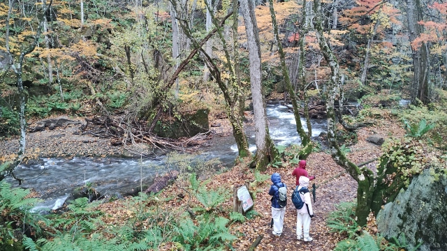 奥入瀬渓流とは、 青森県十和田市の十和田湖から流れ出る奥入瀬川の、子ノ口から焼山までの約14キロメートルにわたる渓流です。14キロありますが、天気の状態が良くないので、今日はとおしでは歩けないでしょう。途中でバスにのることになるでしょう。