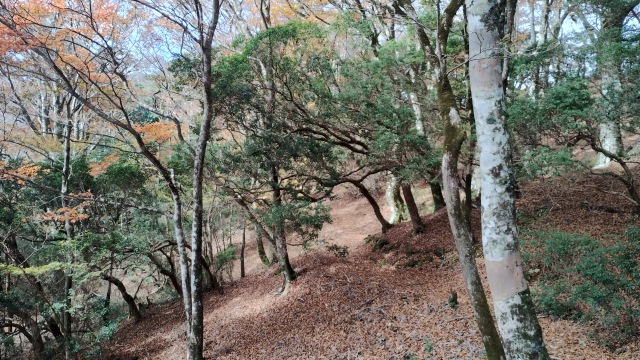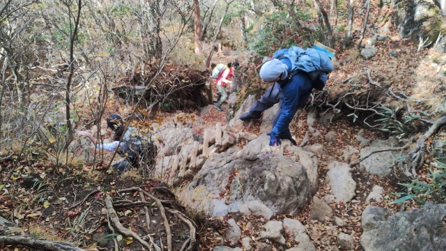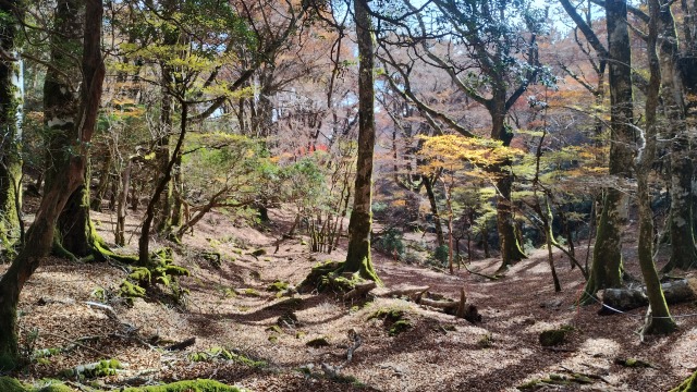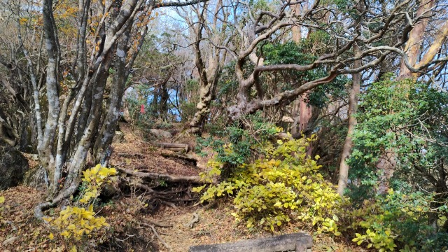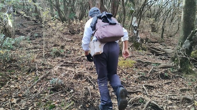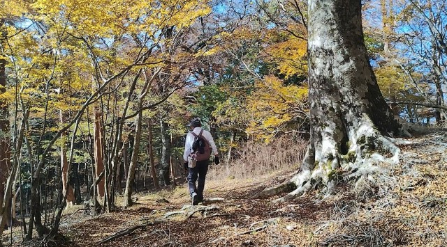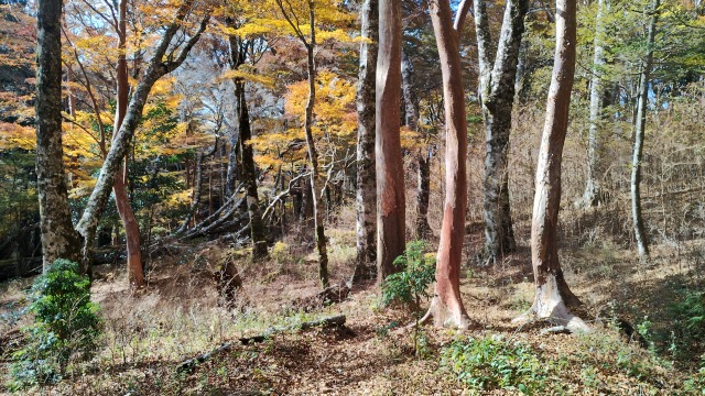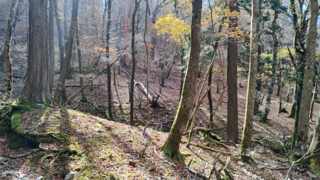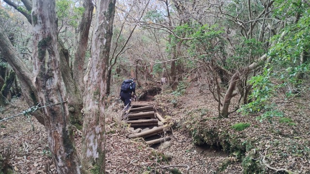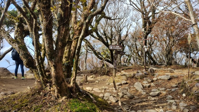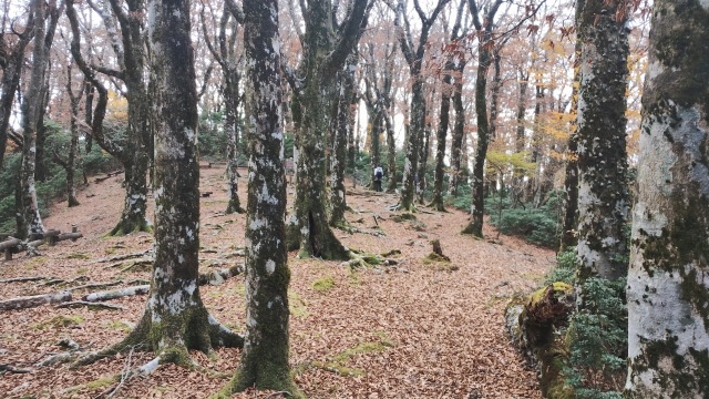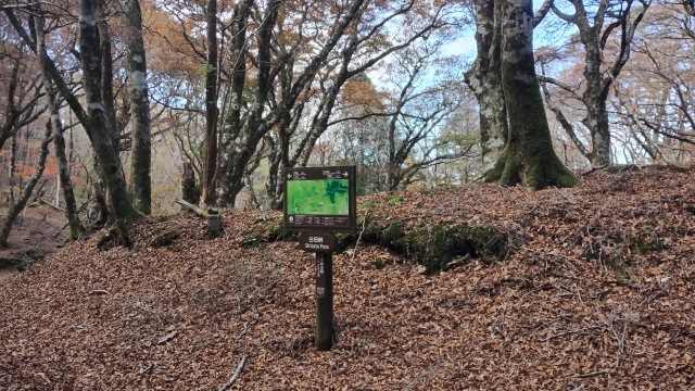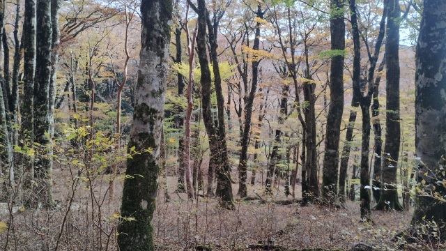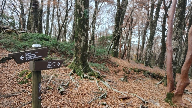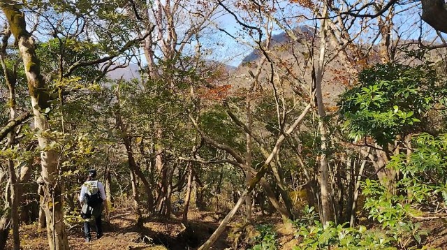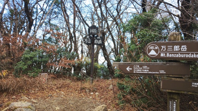 登山道ははいってすぐ下りこむ。そして4つばかり山を越えていくが、その3つ目が万三郎岳(1,406m)です。
