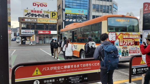 電車到着してからバス発射まで6分しかない。バス便は1日3本しかない。たいへん混んでいた。