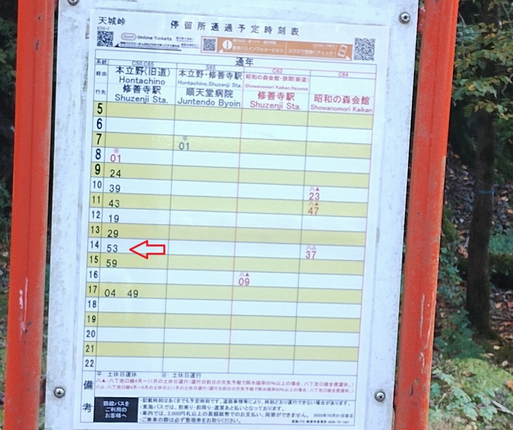 ここから5時間半みておけば天城峠まで行けるはず。なので、10時15分のバスに乗っても最終の一つ前のバスに間に合うが、この時期だと暗くなってしまうので1便で行くことにした。