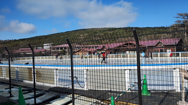 駐車場の南側にスケートリンクらしきものが見えます。さて、アイススケートが、それともローラーか。